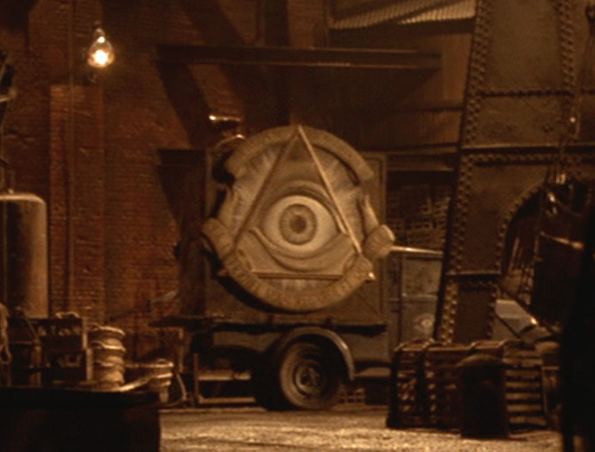 A triangle and eye with scrollwork can be seen on the back of the Cyclops' truck at [00:08:32] with the partially obscured mottoes: