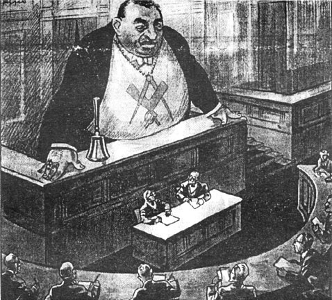 Antisemitism and anti-masonry often implicitely or explicitely go hand in hand. Note the inclusion of the Soviet hammer and sickle below the masonic square and compasses. Neither the context nor the source of this illustration are given although the book in which it is reproduced argues that the Jews are a separate and inferior race. Freemasonry is not otherwise mentioned.