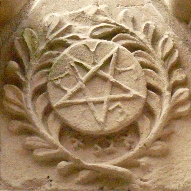 This pentagram in the doorway keystone at 1 rue Jean-Gouthière, in Chaumont, France, is reminiscent of hermetic usage such as Robert Moray's ""mason's mark". It may be a Drudenfuß, or warding against ghosts. "There is perhaps in all this some lingering notion of the association of the German word Drudenfuß with 'Druid'. Unjustly so. The word has nothing to do with the Druids, but with Drude: in Southern German and Austrian popular belief a Drude is a female ghost who causes nightmares." See Cornelia J. de Vogel and Bächtold-Stäubli, Handwörterbuch des deutschen Aberglaubens VIII, col. 1173f. [p. 35.]