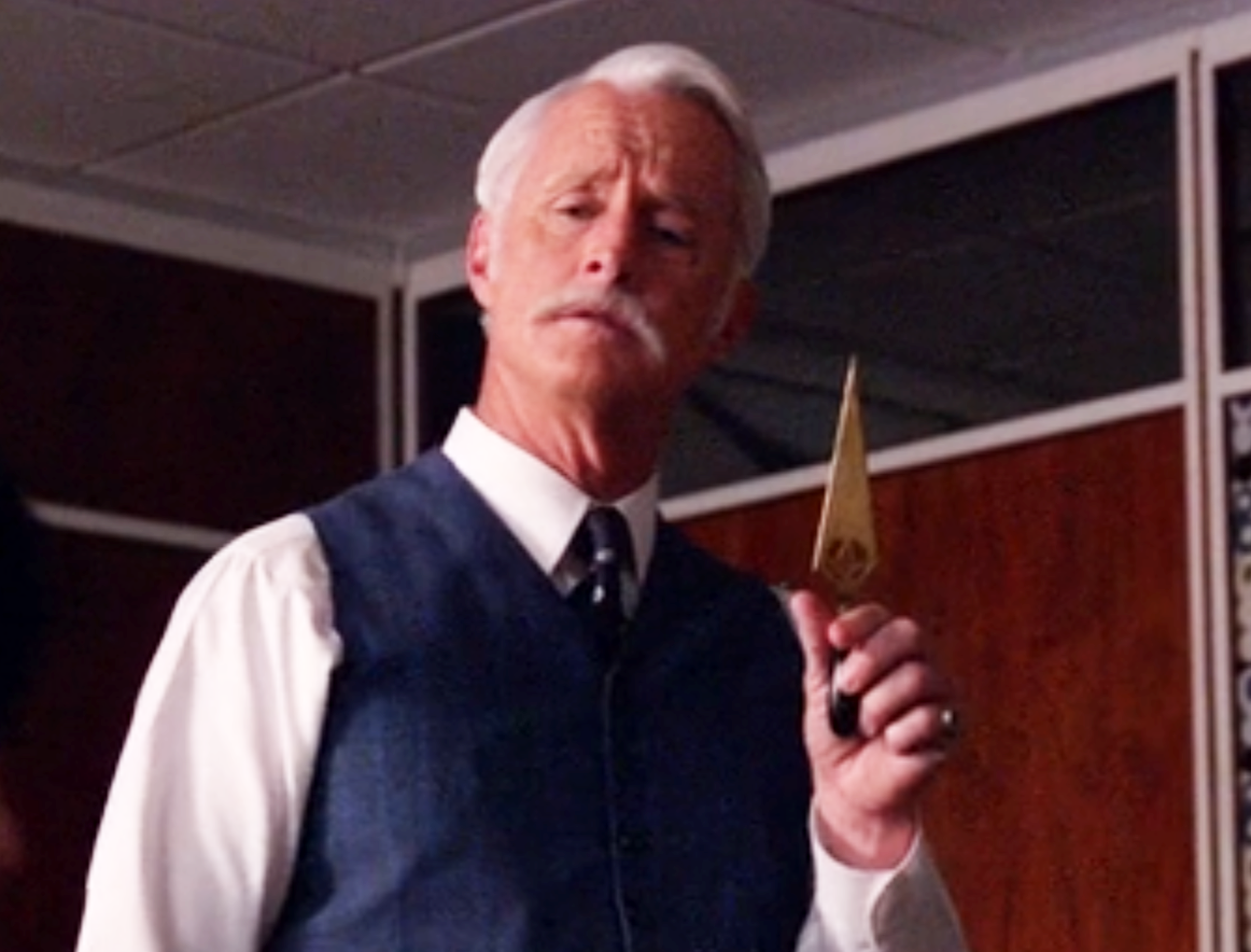 While cleaning out his office, advertising agency senior partner, Roger Sterling, pulls a ceremonial trowel with a masonic square and compasses design out of a packing box, and asks account executive, Peggy Olson (played by Elisabeth Moss): "Know any Freemasons?" She laughs and the conversion moves to other topics [00:34:10]. The intention of the remark is unclear since Sterling is not noted as being a freemason in earlier episodes. While not exactly a role model of high character, Sterling is a highly-regarded father figure and might be expected to be a freemason.