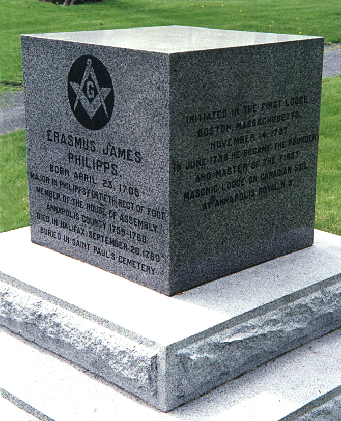 Erasmus James Philipps (1705-1760) was made a Master Mason in Boston on 14 November 1737. Henry Price appointed him as Provincial Grand Master over the Free and Accepted Masons in the Province of Nova Scotia sometime prior to 13 March 1738. Philipps returned to Annapolis Royal in June 1738 and shortly thereafter constituted his first lodge.